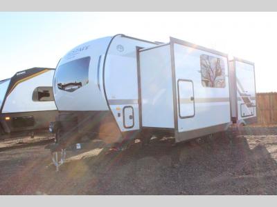 Each model is constructed with a fully laminated walkable roof, 6-sided full-aluminum frame, and a fiberglass front cap with Clear Coat for added protection. You will appreciate the slam baggage doors and 200W solar panel outside, plus there is a Climate Protection Package for better insulation. Inside, you'll love the solid surface countertops, roller shades, and soft close roller bearing drawers.